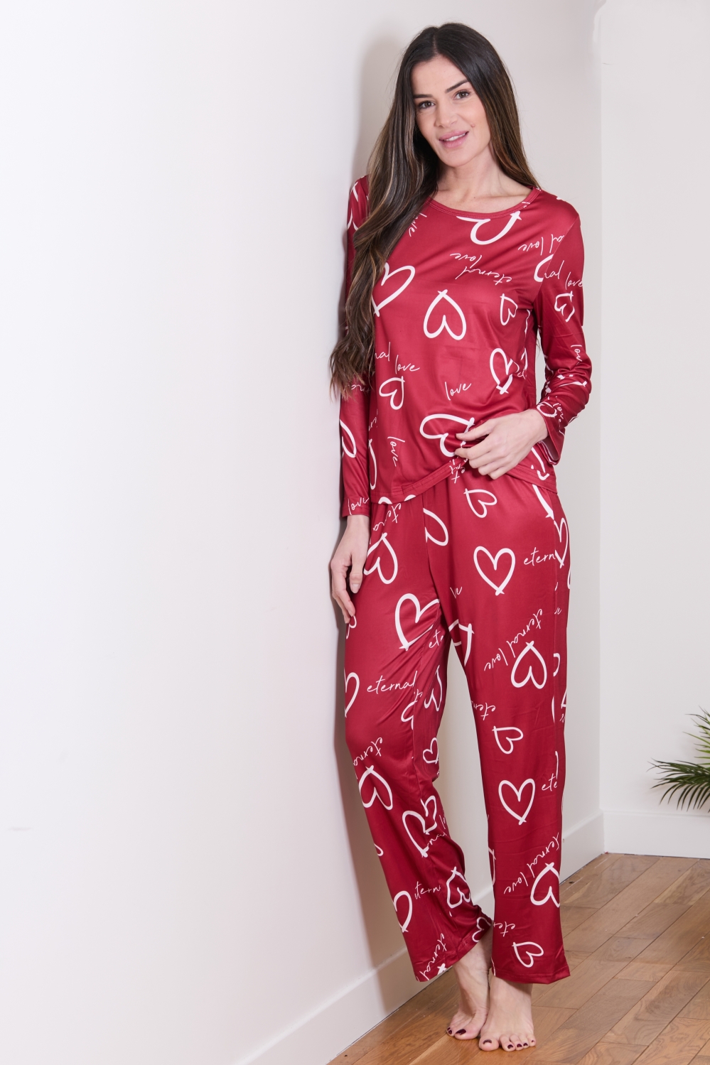 2-piece pyjama set consisting of a long-sleeved, round-neck top with hearts and silk-screen print and straight, hearts and silk-screen print trousers with elasticated waistband.