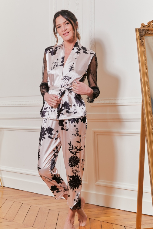 1 bata kimono floral de satén con mangas largas de tul y bajo de mangas de encaje con cinturón desmontable y 1 pantalón de satén con cintura elástica y detalle de encaje en el bajo
