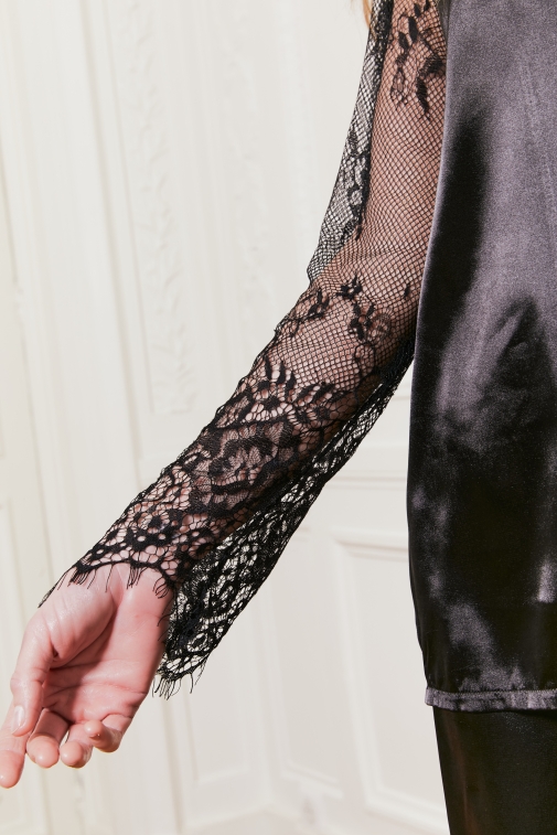 1 top de satén abotonado con cuello sastre y mangas largas de encaje y 1 pantalón de satén con cintura elástica y detalle de encaje en el bajo del pantalón.