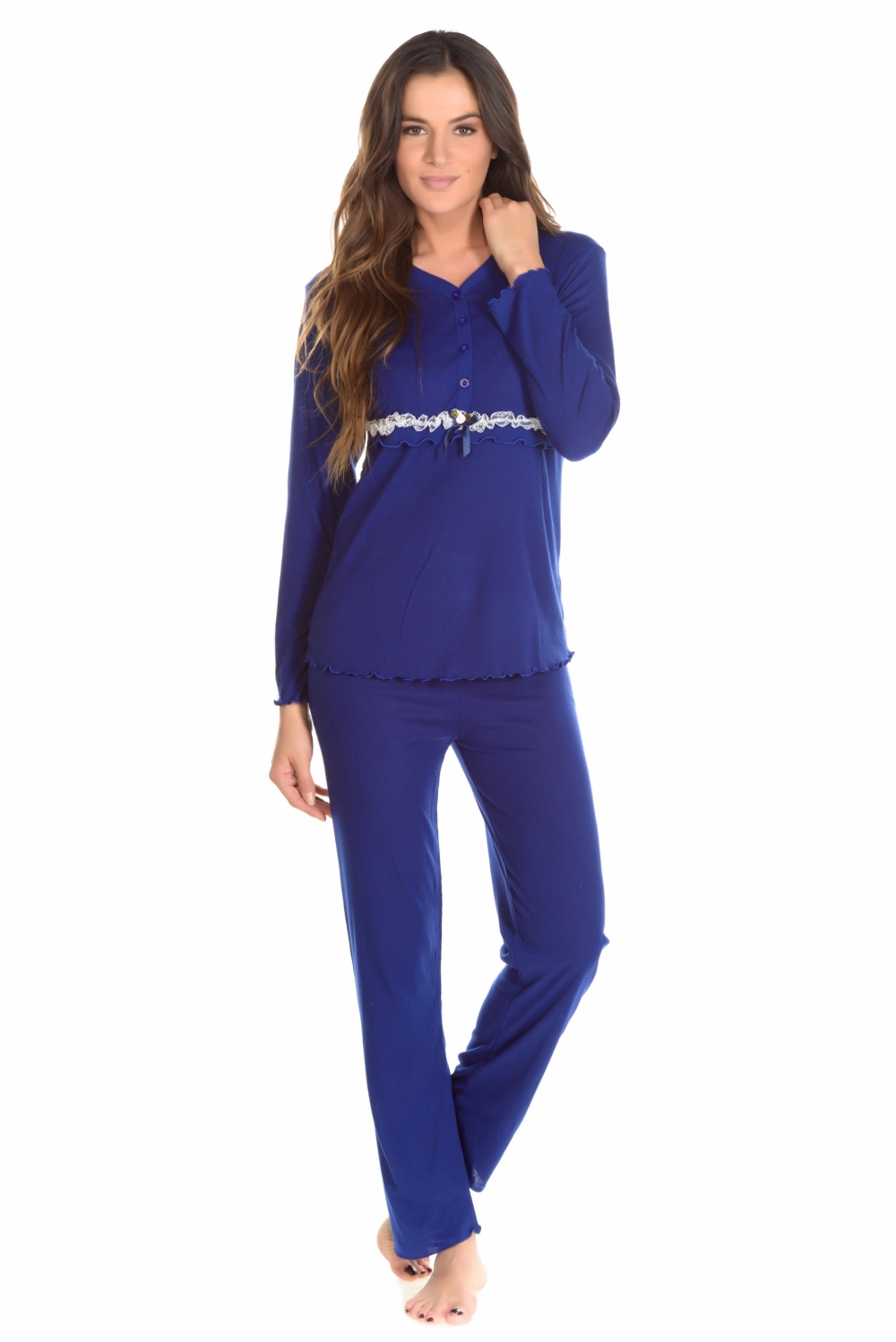 Acabamento em folho na camisola e nas mangas.