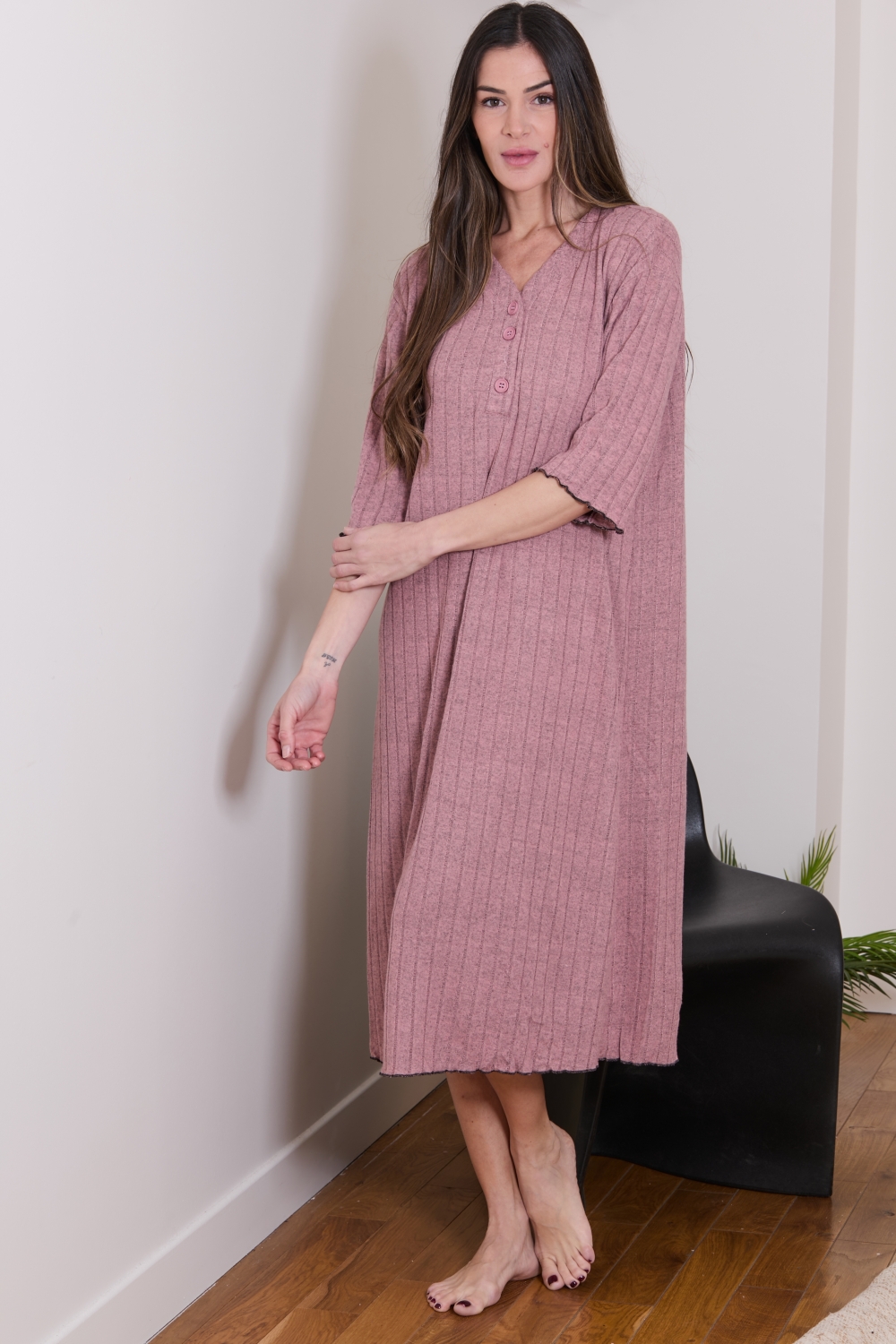 Camisa de noite comprida de manga 3/4 com pormenor de decote em V em cor contrastante e botões à frente