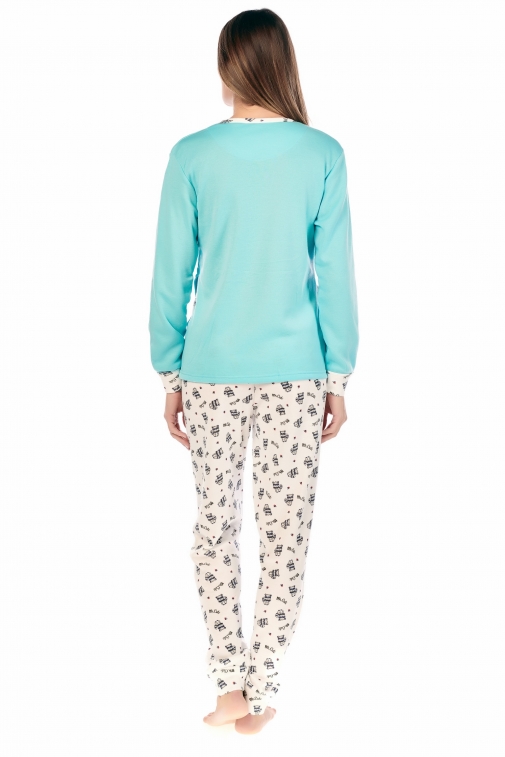 Gola redonda e mangas terminadas com uma repetição do padrão das calças